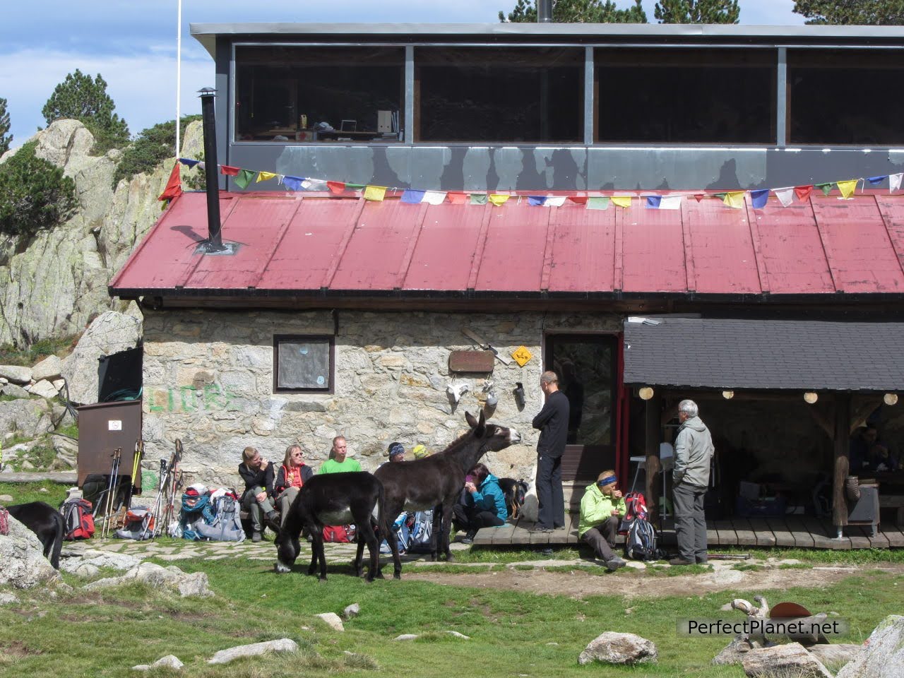 Continuamos hasta el lago Gran y el puerto de Ratera, con unas vistas impresionantes, desde el cual divisamos nuestro siguiente objetivo el refugi de Saboredo. Es pequeño y tiene dos burros muy majos que enseguida nos piden comida. Tomamos un refresco, comemos y charlamos con el guarda.