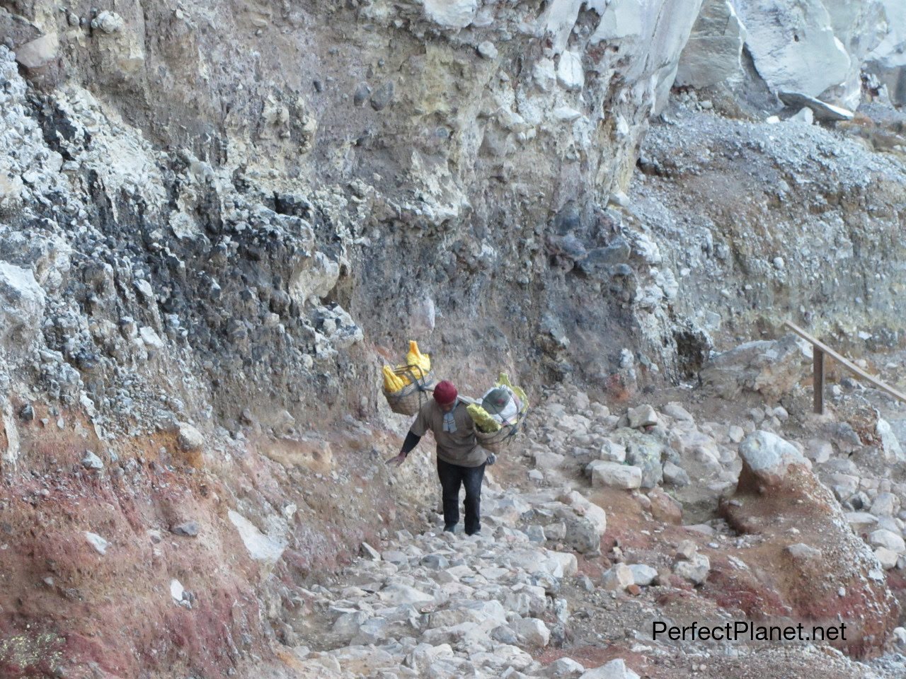 The miners work tirelessly day and night to extract the sulfur. We approach the fumaroles to see what they call "blue lava" which is the gas that is ignited in contact with the outside. The smell is overwhelming. The miners take out the solid sulfur and fill the baskets, they also collect liquid sulfur and pour it into small molds that when it solidifies sell it as a souvenir.