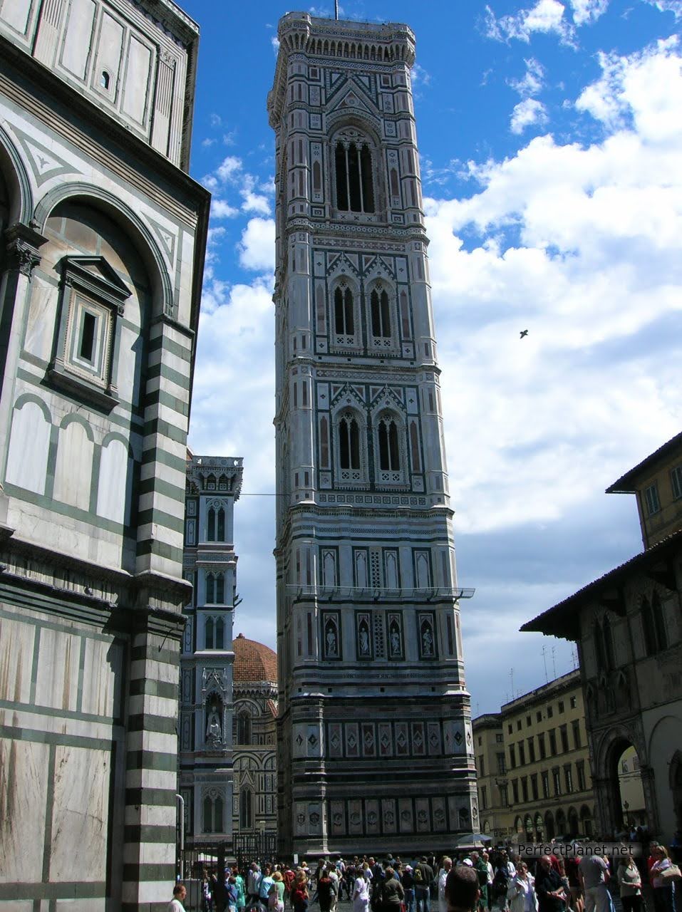 The façade is made of white and green marble. The Campanile, built by the master Giotto with the same materials as the Cathedral, stands out. It is a beauty. Not to be missed.